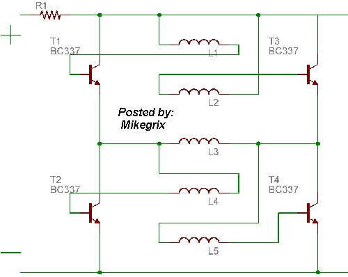 Si tratta del conosciutissimo ponte ad H fatto a transistor, che può quindi alimentare l'avvolgimento L3 con entrambe i sensi di corrente. Gli avvolgimenti L1, L2, L4, L5 funzionano da retroazione e vanno a "spegnere" il transistor che si é appena "acceso", "accendendo" quello che si é appena "spento" (permettetemi questi termini grossolani...)