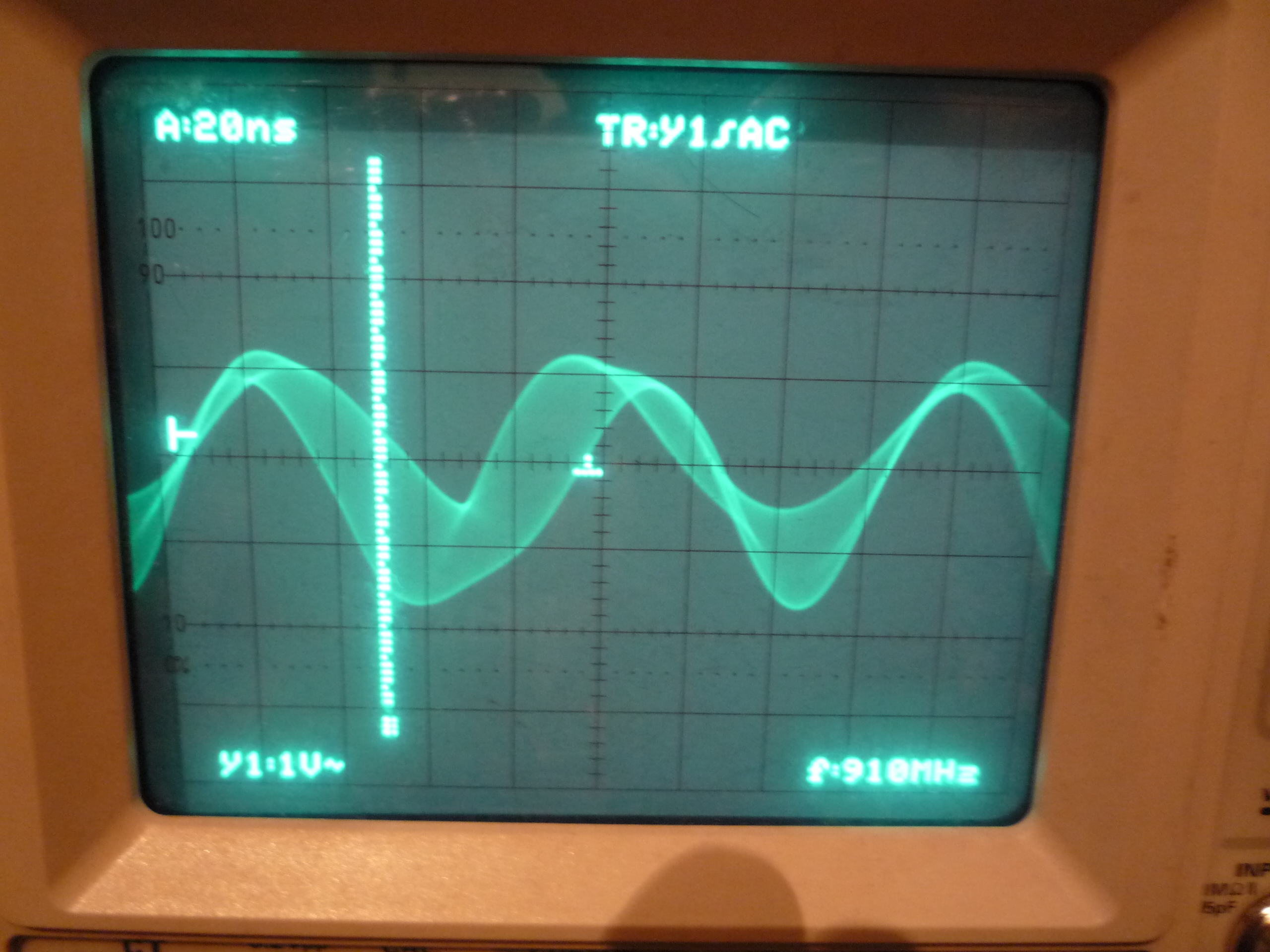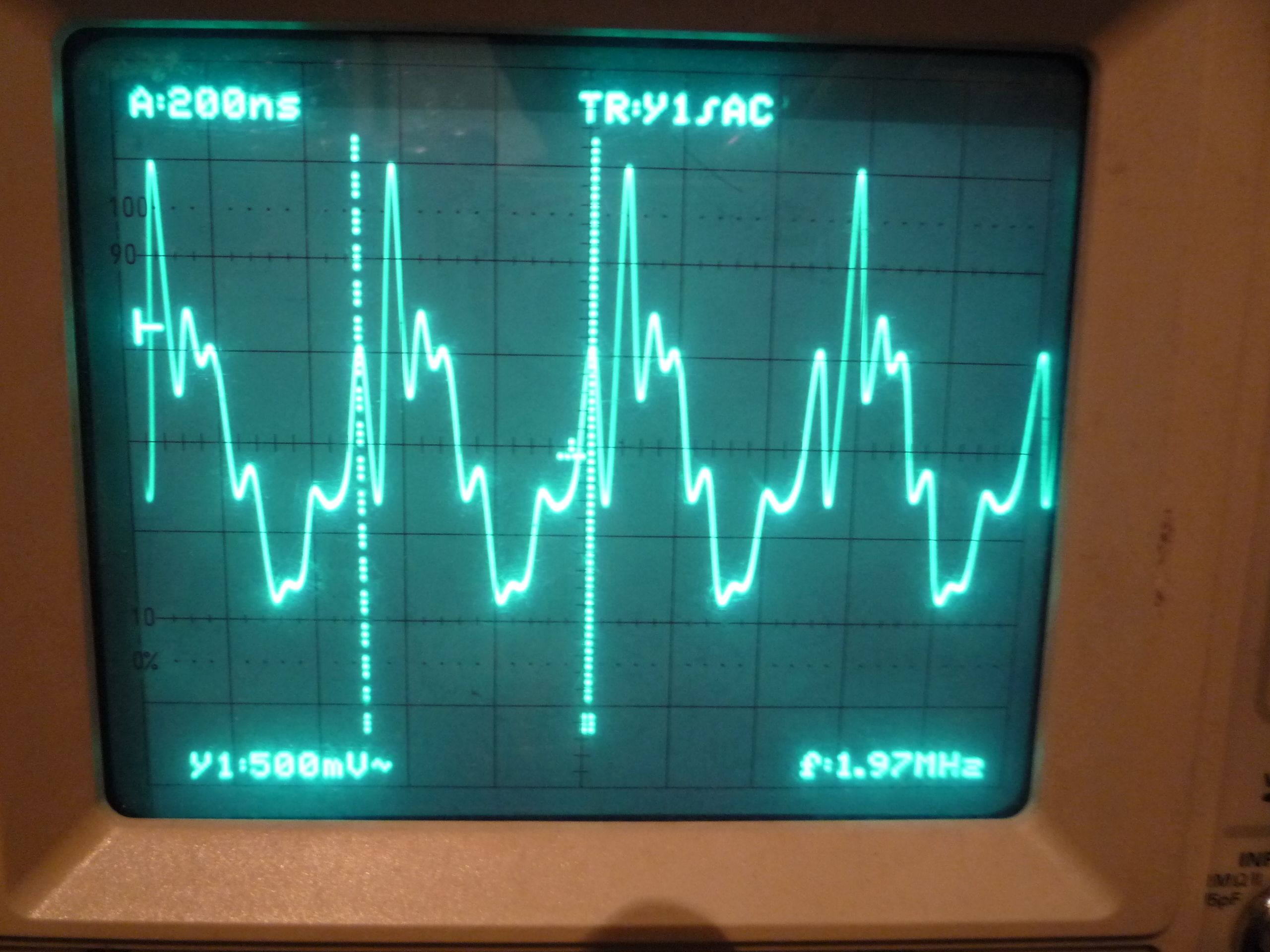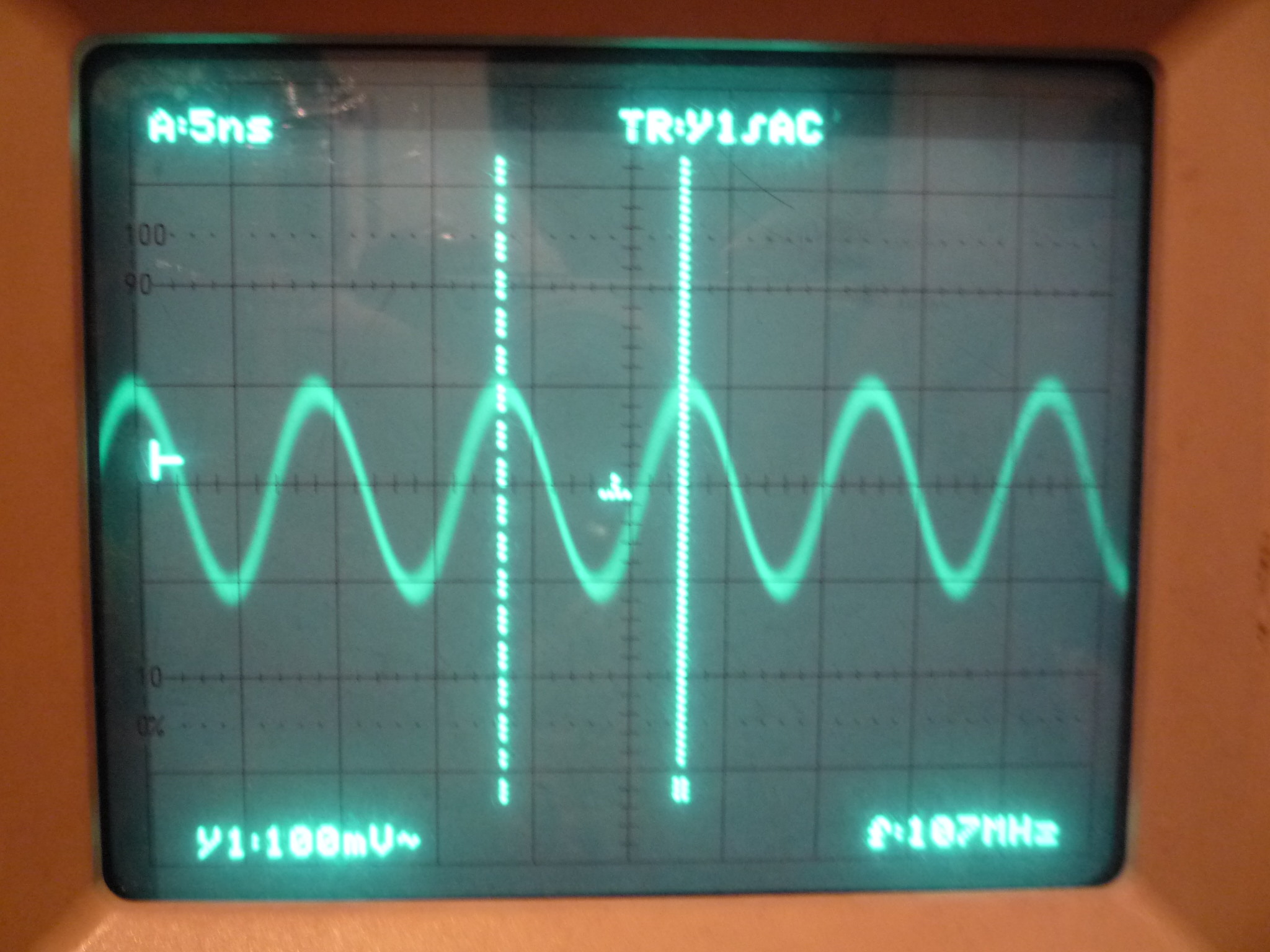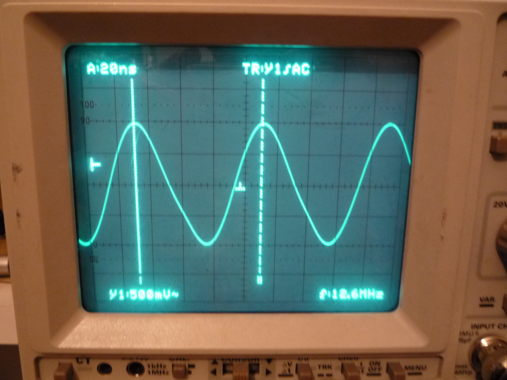 Qui invece sono stati messi due condensatori da 330pF fra B3 e massa e B4 e massa, bella sinusoide da 12,6 MHz: