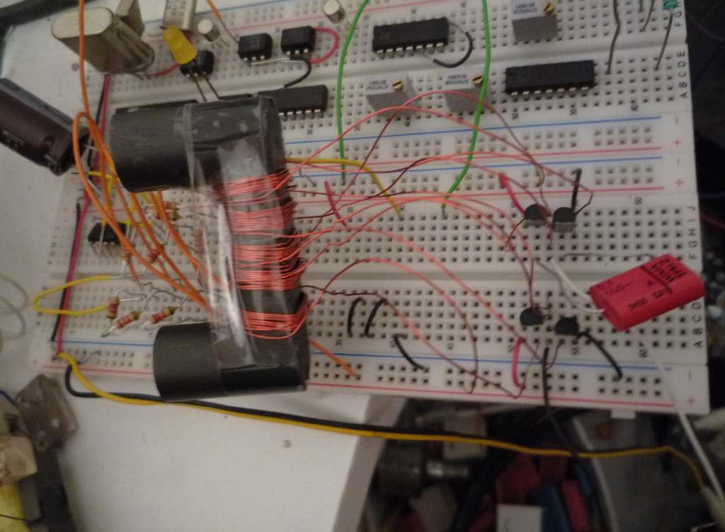 Bene, e adesso? Oscilloscopio, misure, stress del circuito e variazioni improvvisate! Questo circuito si presta infatti a numerose modifiche; staccando la retroazione sulle basi dei 4 transistor ed inserendo delle reti fatte da condensatori, resistenze ecc ecc, vengono fuori dall'avvolgimento L3 le forme d'onda più strane, le frequenze più assurde ed anche andamenti perfettamente regolari! La cosa bella é che il tutto, una volta modificato, rimane perfettamente stabile!